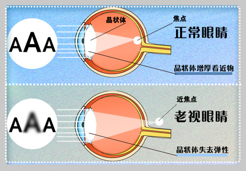 老视是由于年龄增长所致的眼睛生理性调节功能减弱而出现的视近困难且不能持久的现象。随着年龄增长,眼球内的晶状体逐渐硬化、增厚,眼内睫状肌的调节能力也随之减退,导致变焦能力降低。看近处时,影像无法完全聚焦,近距离的物体就会变得模糊不清。